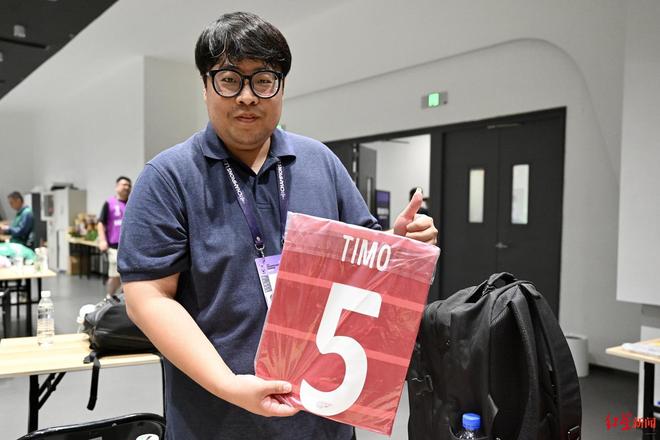 ▲韩国记者韩奎彬专门买了一件成都蓉城球员提莫的球衣